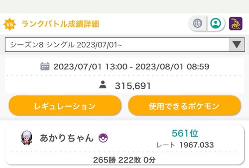 どうも、あかりちゃんです。 S8終了直後に公開しようと思っていた構築記事が下書きに眠っていたままになってたので公開します! 色々追記しようと思ったけど、この構築についてほぼ忘れかけてるのでそのまま公開します!!! 【結果】 【コンセプト】 【構築…